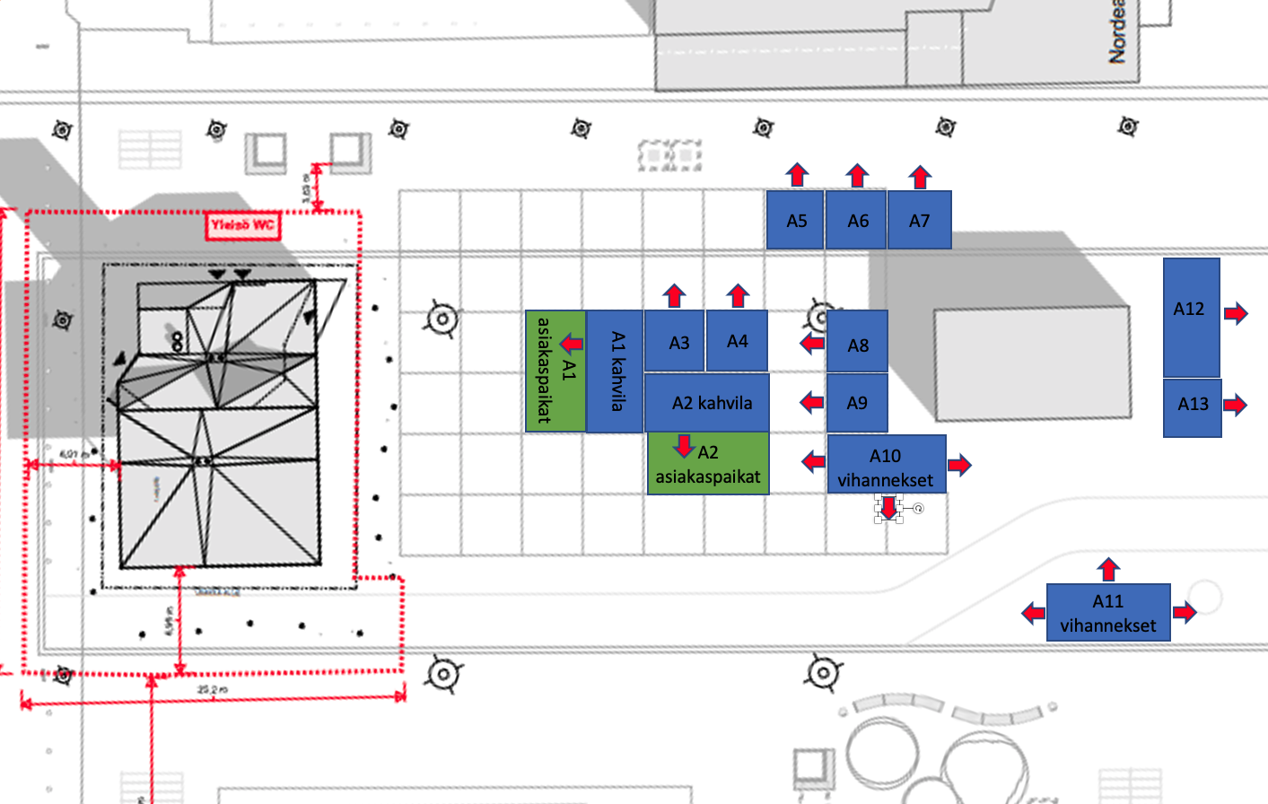 Kahvilatoiminnalle on osoitettu 8 x 8m (= 4 ruutua), mistä myyntivaunulle 8mx4m ja istuinpaikoille 8mx4m.